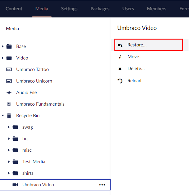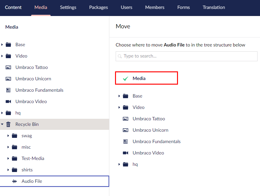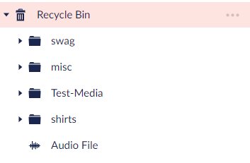 The Recycle Bin is a separate tree structure within the Media tree. Clicking on the arrow next to the Recycle Bin will display its contents.
