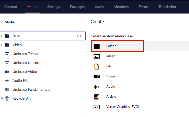 Folders help organize the Media section and keep similar media items in a logical structure. We recommend using folders to organize your media items. When your media library starts growing, folders help in locating media quickly and easily.