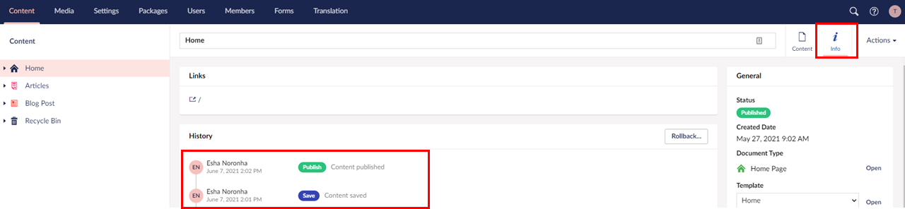 Within the Info content app for pages you can find the Audit Trail in the History section. Here, you can get a quick overview of the actions performed on that node, by whom, when and any additional comments.