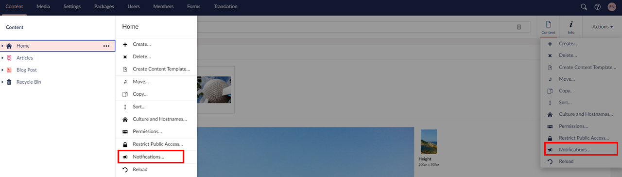 The notification settings apply to the chosen content item as well as any child items that appear below the item in the content tree.