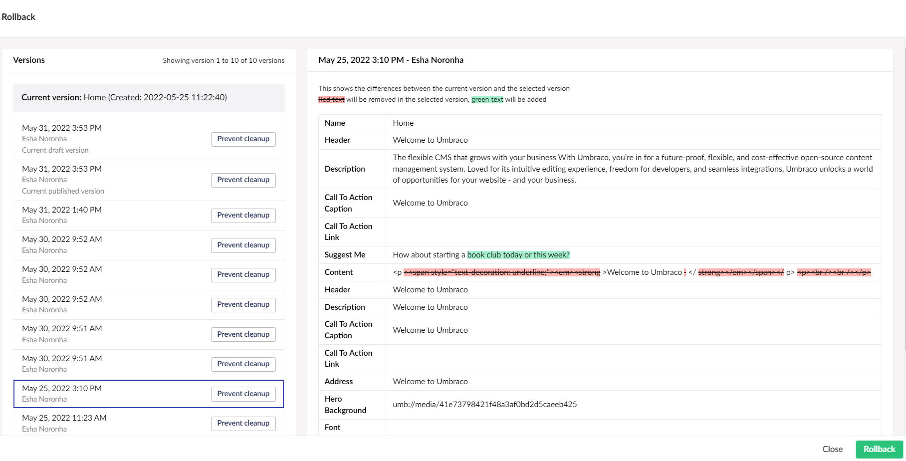 The Rollback window opens. Select a version you wish to compare with.After selecting the version, a comparison of the current page with the version you selected is displayed. The text highlighted in red and striked-out will not appear in the selected version and the text highlighted in green means the text that will be added, should you choose to rollback to that version of the page.