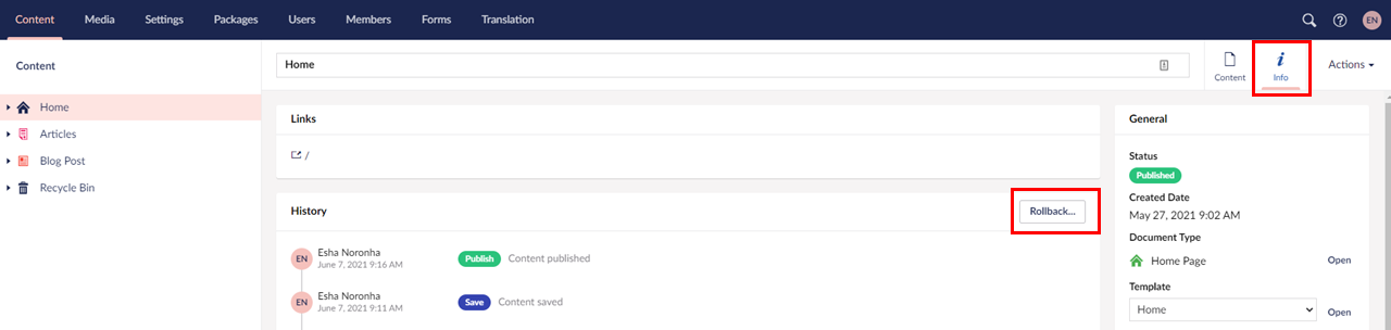 Click on the Rollback button in the History section.